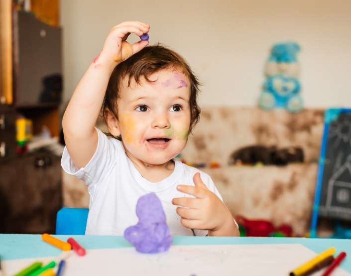 Children express themselves through various art projects, using different materials.